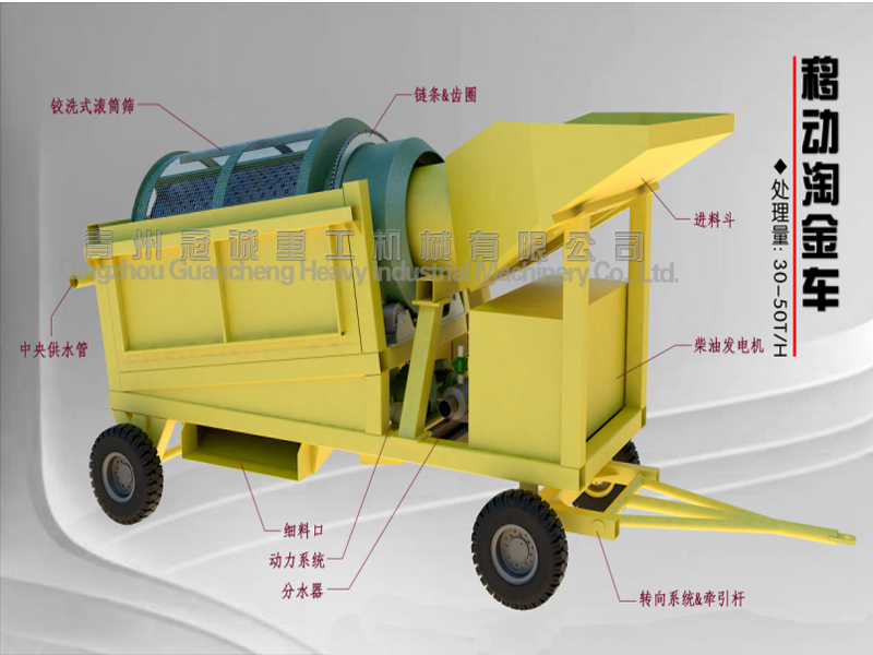 The mobile gold mining car can use a variety of small excavators, loaders and other feeding methods, suitable for the majority of gold ore, such as sand gold, rock gold tailings, etc.